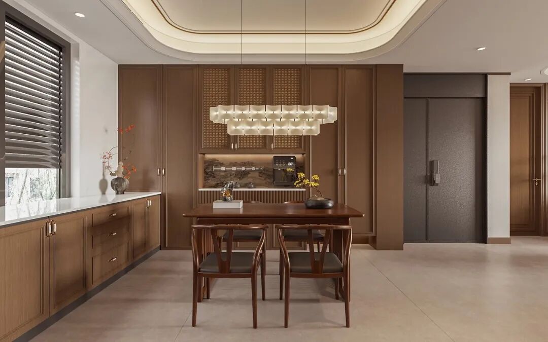 當(dāng)暮色漫進(jìn)房間,餐邊柜上的青瓷瓶插著兩支新折的臘梅,木門的光影落在地板上,像鋪開了一幅淺淡的宋畫。品橋用全屋定制做筆,以宋韻為墨,終于把 “古人的雅致”,寫成了現(xiàn)代人觸手可及的日常。