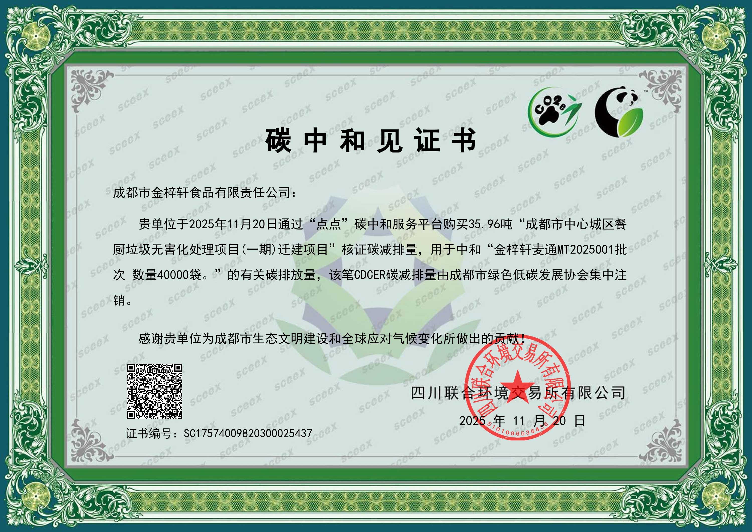 經專業機構對全生命周期數據的系統核算,金梓軒 400g 麥通于2025年11月通過在 “點點” 碳中和服務平臺購買35.96噸 “成都市中心城區餐廚垃圾無害化處理項目(一期)遷建項目”核證碳減排量完成抵消,該筆CDCER碳減排量已由成都市綠色低碳發展協會集中注銷,確保碳中和成果真實可追溯、無爭議。此次斬獲的碳足跡標簽、碳中和標簽及碳中和見證書(證書編號:SC17574009820300025437),是對金梓軒 400g 麥通低碳屬性的專業背書,也標志著這款經典零食正式邁入 “零碳” 行列。