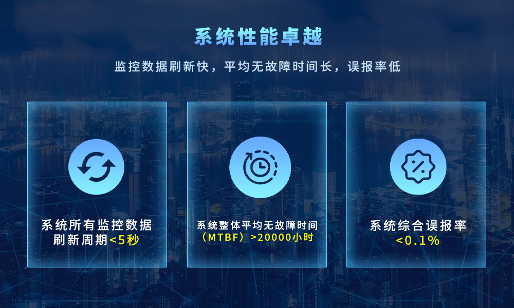 強(qiáng)大的系統(tǒng)性能:系統(tǒng)監(jiān)控數(shù)據(jù)刷新周期小于5秒,平均無故障時間(MTBF)大于20,000小時,綜合誤報率低于0.1%,確保了監(jiān)控的實(shí)時性、可靠性與準(zhǔn)確性。